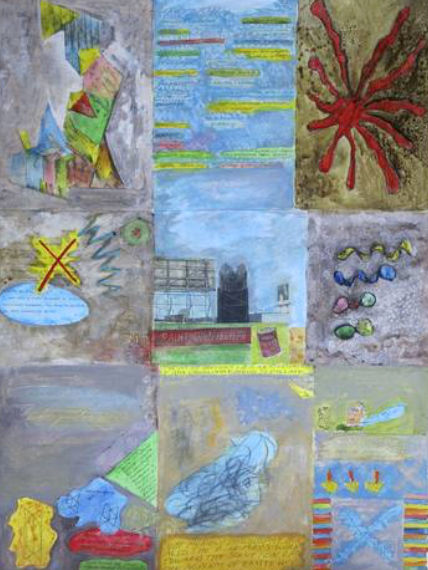 Kandinksy’s “emanation” (an effect of the interplay of contrasts) already implies a metaphysics of art. The multiple panels of comic strips are an ideal surface division for the picture plane. I am inspired by flea-markets, weather-beaten walls embellished with graffiti, and the impromptu art fairs of the favelas. Anonymous graphic traces symbolize the marred moments of an as yet undisciplined happiness. Ciphers of liberation, promulgate the ideal of pure receptivity freed from immediate desire, bearing witness to the great refusal, intransigent and oracular. Futuro-primitive graphisms resemble unformed perceptions preceding cognition. Archival methods meet a desire for oblivion as the need to demonstrate potentially infinite variations satisfies a repetition compulsion, illustrating the truth of Rimbaud’s famous catch-phrase: Je suis un autre. (I am another.) Fragments of writing provoke a rage of erasure creating the substrata for a glowing surface. Drowned in a torrent of deletions, half-glimpsed phrases become talismanic. In a spangled grotto, an inner-landscape of text, hieroglyphs of synesthesia.
