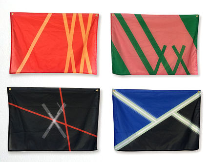 1. Flags of the province of all mankind. (P.O.A.M.) are imaginary representations of the impossible dream of social and spiritual cohesion without the false values of “totalization.” They contain symbolic conceptual canceling “X” as an allusions to the history of the church. These flags are offered to a colonial adventure of the outer space by sci-fi evangelists.